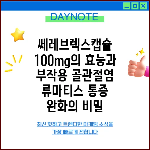 쎄레브렉스캡슐 100mg은 골관절염이나 류마티스 관절염으로 인한 통증 완화에 매우 효과적입니다. 이 약물은 염증 반응을 감소시키는 것이 주효하여 많은 환자님들이 통증에서 해방될 수 있도록 도와주고 있습니다. 하지만, 부작용을 주의해야 하며, 복용 전 전문가의 조언을 받는 것이 필요합니다. 통증 관리와 함께 건강한 생활습관을 유지하는 것이 골관절염과 류마티스 관리의 핵심입니다. 여러분도 쎄레브렉스를 통해 생활의 질을 높여보시길 권장드립니다.